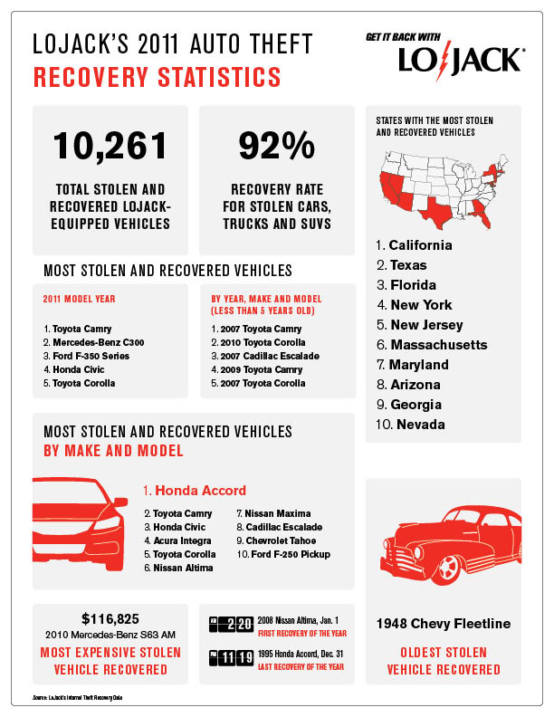 Lojack has an interesting infographic on most stolen vehicles, including the worst cities for vehicle thefts — California,Texas and Florida top the list. The Lojack graphic is on the next page, including which cities you are most likely to have your car stolen.