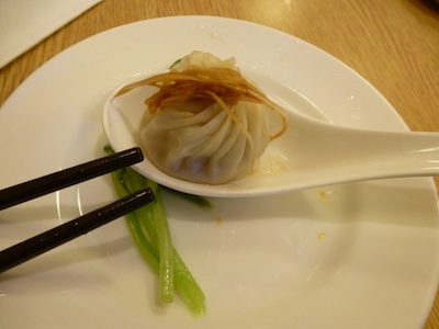That’s a Din tai Fung specialty – a dumpling you place in a deep ceramic spoon and stab with a chopstick to release the soup inside it. You eat the pierced dumpling and its sip of soup all together in one delicious mouthful.