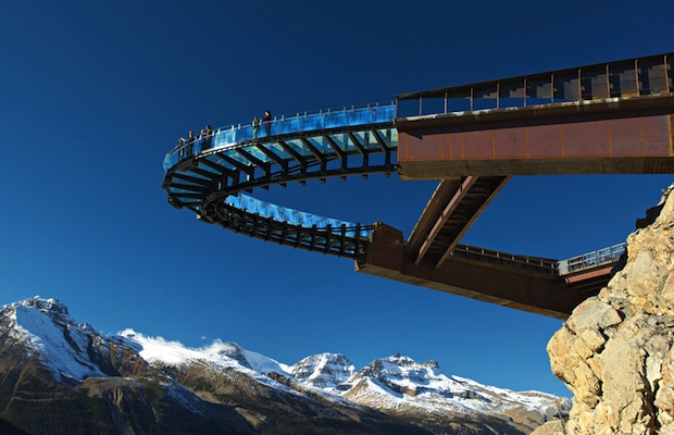 The Glacier Skywalk opened recently in Jasper National Park, near Banff, Canada, 918 feet above the Sunwapta Valley floor.  It’s a horseshoe-shaped skywalk that juts out around 100 feet from the cliff, with a see-through glass floor that lets you look down without getting too close to the edge.  Or, look to the horizon for glimpses of the snow-capped peaks of the Canadian Rockies.