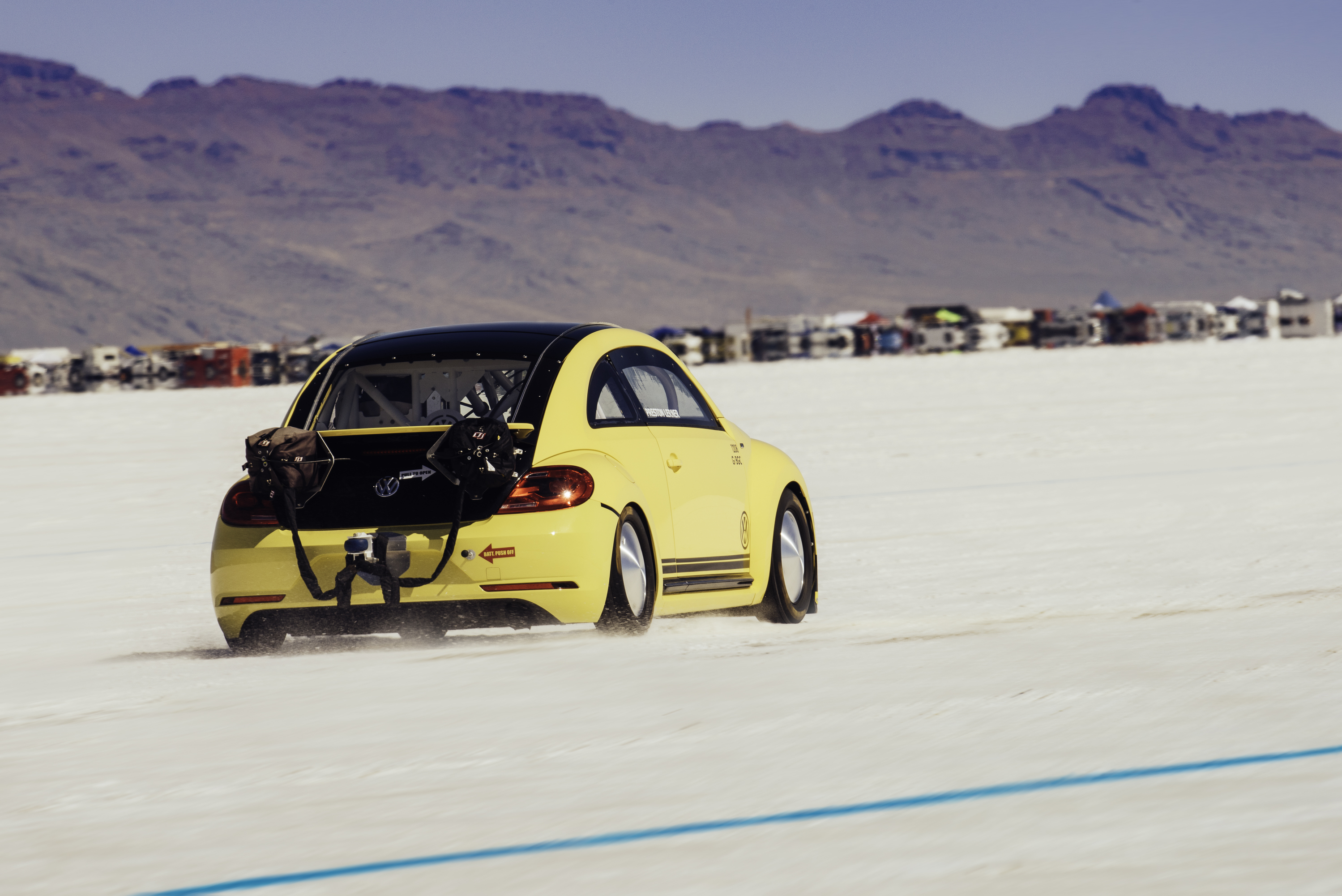 To help slow the car down at the end of the scorching one-mile speed run, the souped-up R-Line Beetle also was fitted with a pair of parachutes attached to the back.