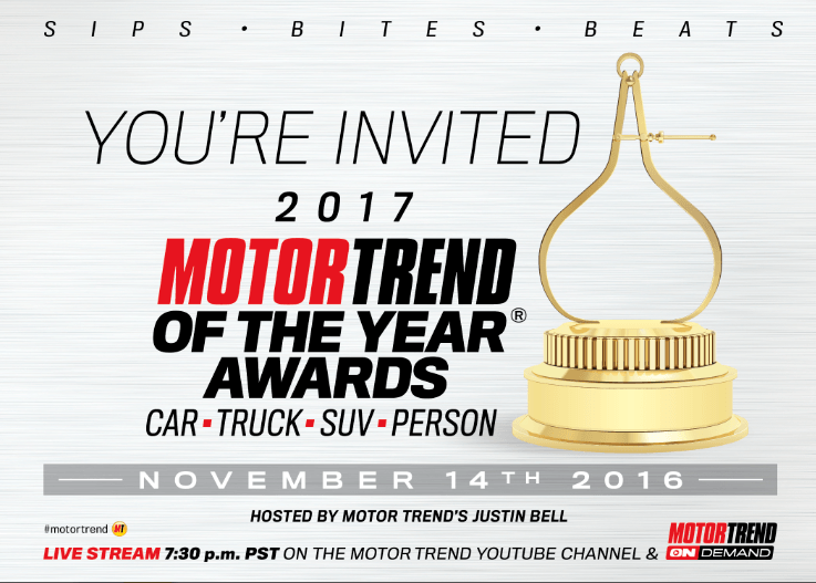 Leading up to, and during the event, MOTOR TREND Award content is being featured on its website, culminating with the gala showcasing the winners of MOTOR TREND’s 2017 Car of the Year, Truck of the Year, SUV of the Year and Person of the Yearm streamed live on MOTOR TREND’s YouTube channel at 7:30 p.m. PST on November 14, 2016.