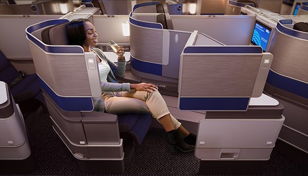 United Airlines Polaris offers passengers spacious, adjustable chairs arranged in the chess-board fashion, which allows you to fully isolate yourself from the rest of the cabin with the help of special automated doors and included headphones.