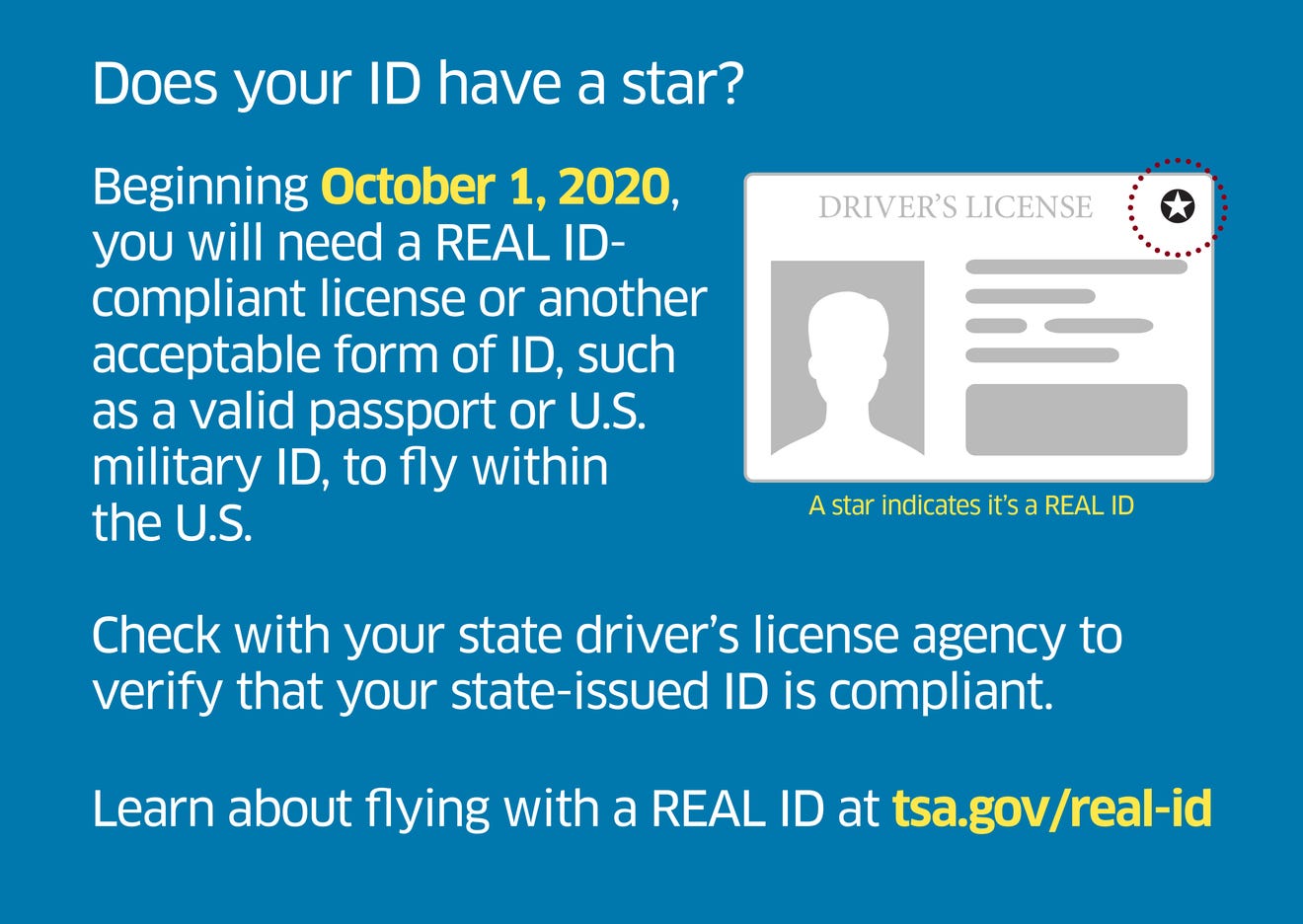 Starting in October 1, 2020, you will not be able to use your driver’s license as identification to get through security unless it has a star that identifies it as complying with the REAL ID Act.
