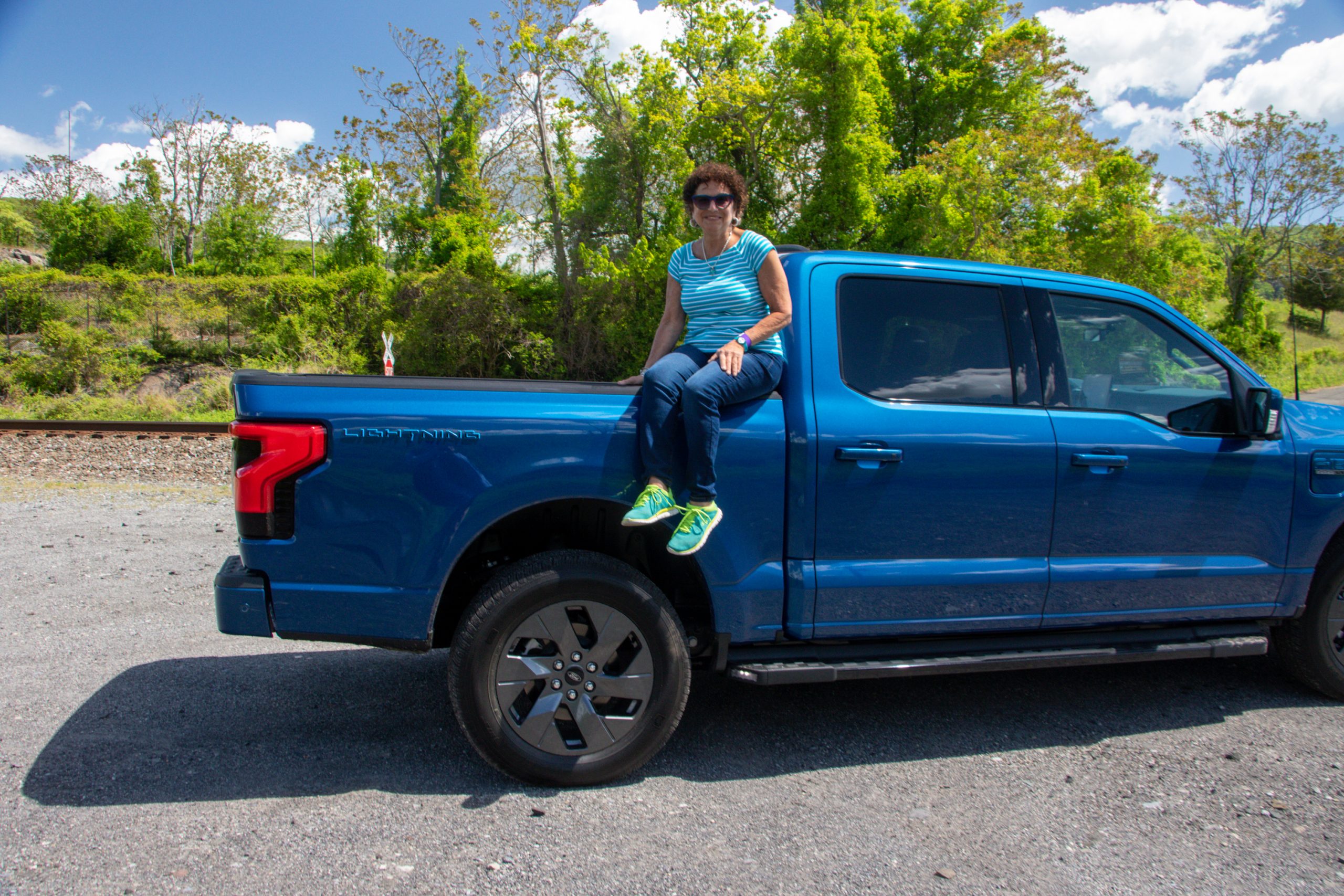 Yes, that’s me, ecoXplorer Evelyn Kanter, perched aboard the bed of the EV truck that’s breaking sales records, on a photo stop during a recent test drive.