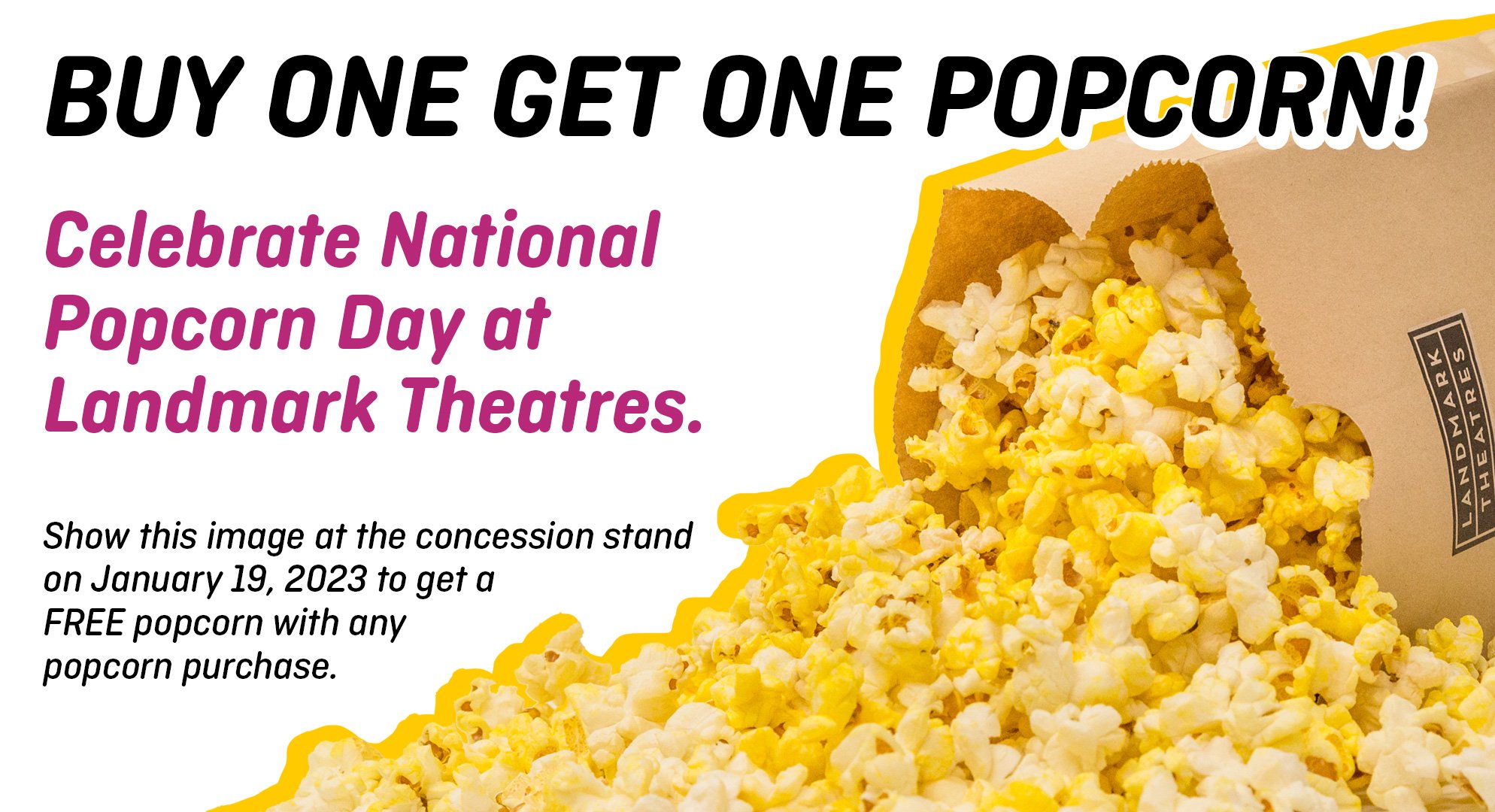 Landmark Theatres has a special BOGO offer for movie and popcorn lovers. The theatre company is offering buy one, get one popcorn on National Popcorn Day.