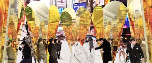 Times Square has been an icon of romance since that world famous kiss celebrating the end of World War II. It’s especially romantic again this year with a public art display of a dozen ten-foot-high glittering gold hearts, inviting kissing, with or without selfies.