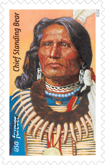 The stamp features a portrait of Chief Standing Bear by illustrator Thomas Blackshear II, who based the portrait on a black-and white-photograph taken in 1877.
