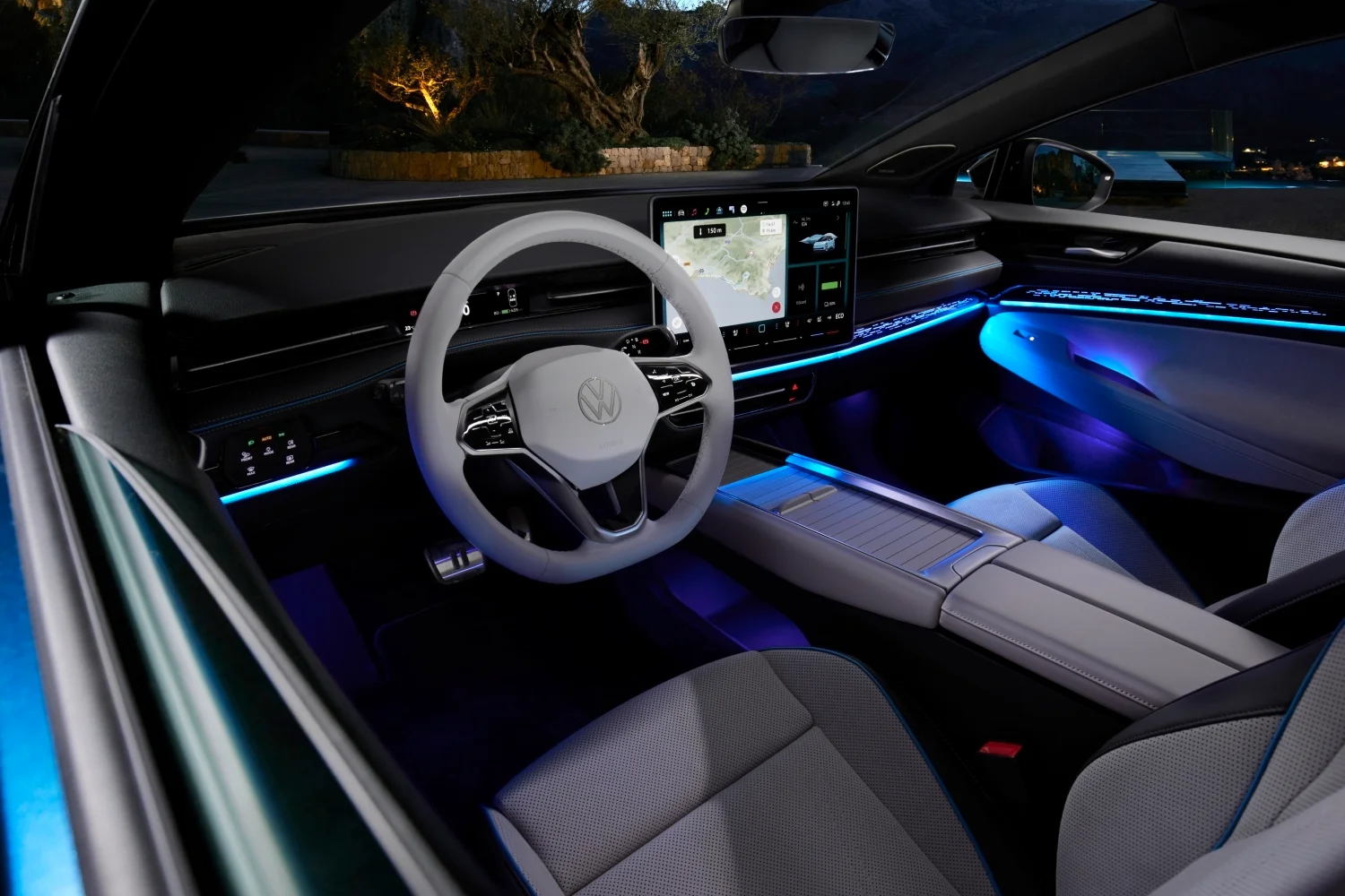 The available electro-chromic dimming panoramic sunroof is something currently offered only by premium competitors. It can be switched between opaque and transparent settings by touch control. Like many other functions in the ID.7, the roof can also be operated by means of natural voice commands, using the new IDA voice assistant.
