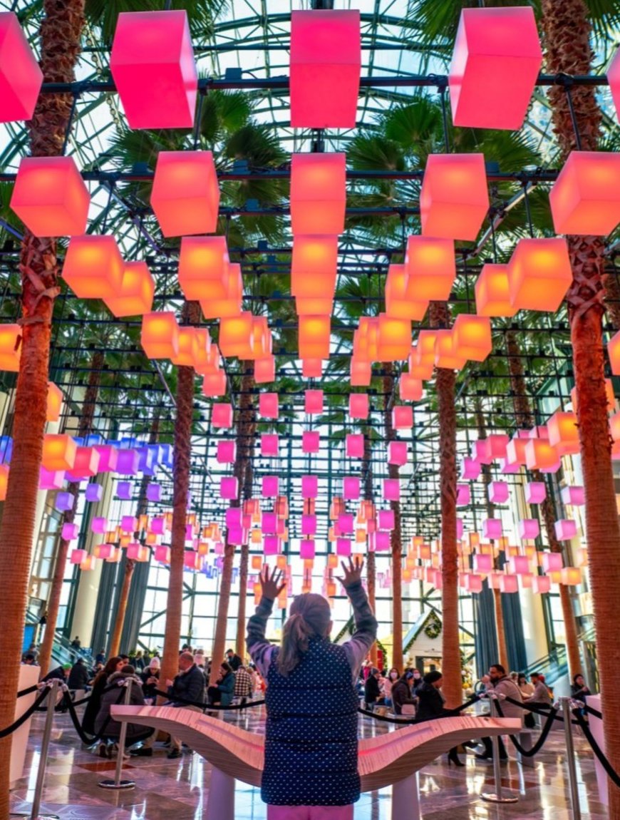 It is one of the most mesmerizing light shows in town. More than 600 colorful lanterns hang from the soaring glass atrium of the Winter Garden, changing color, pattern and intensity.