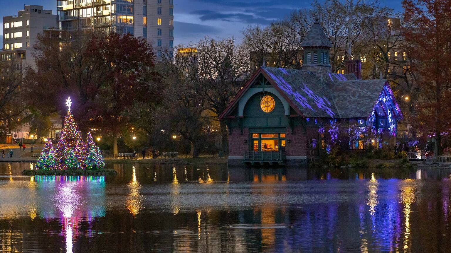 The tree lighting ceremony includes caroling, Santa with gifts of hot chocolate, along with the lighting of a flotilla of trees floating on the Harlem Meer.
