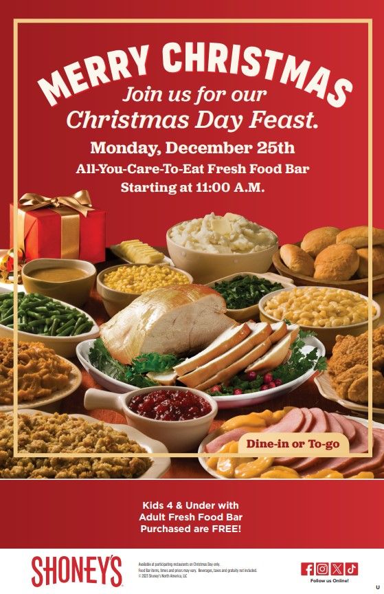 Shoney’s will feature its homestyle, All-You-Care-To-Eat, Freshly Prepared Christmas Day Feast, including holiday favorites like slow-roasted, hand-carved-in-house turkey, cornbread dressing, sliced ham, creamy mashed potatoes and gravy, homestyle green beans and corn bread. To-go individual meals will also be available.