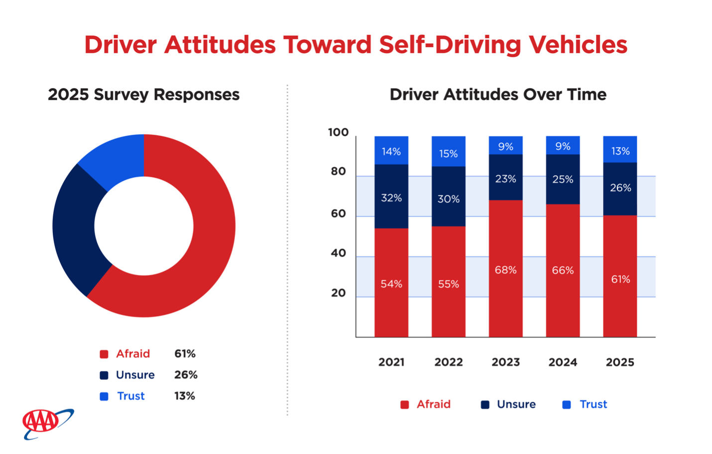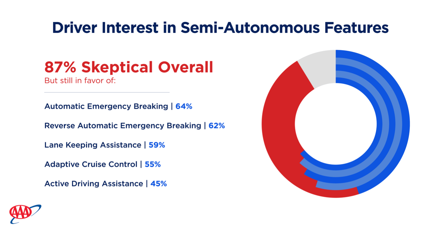 According to AAA’s latest survey on autonomous vehicles, 13% of U.S. drivers would trust riding in self-driving vehicles – an increase from last year, when this number was 9%.