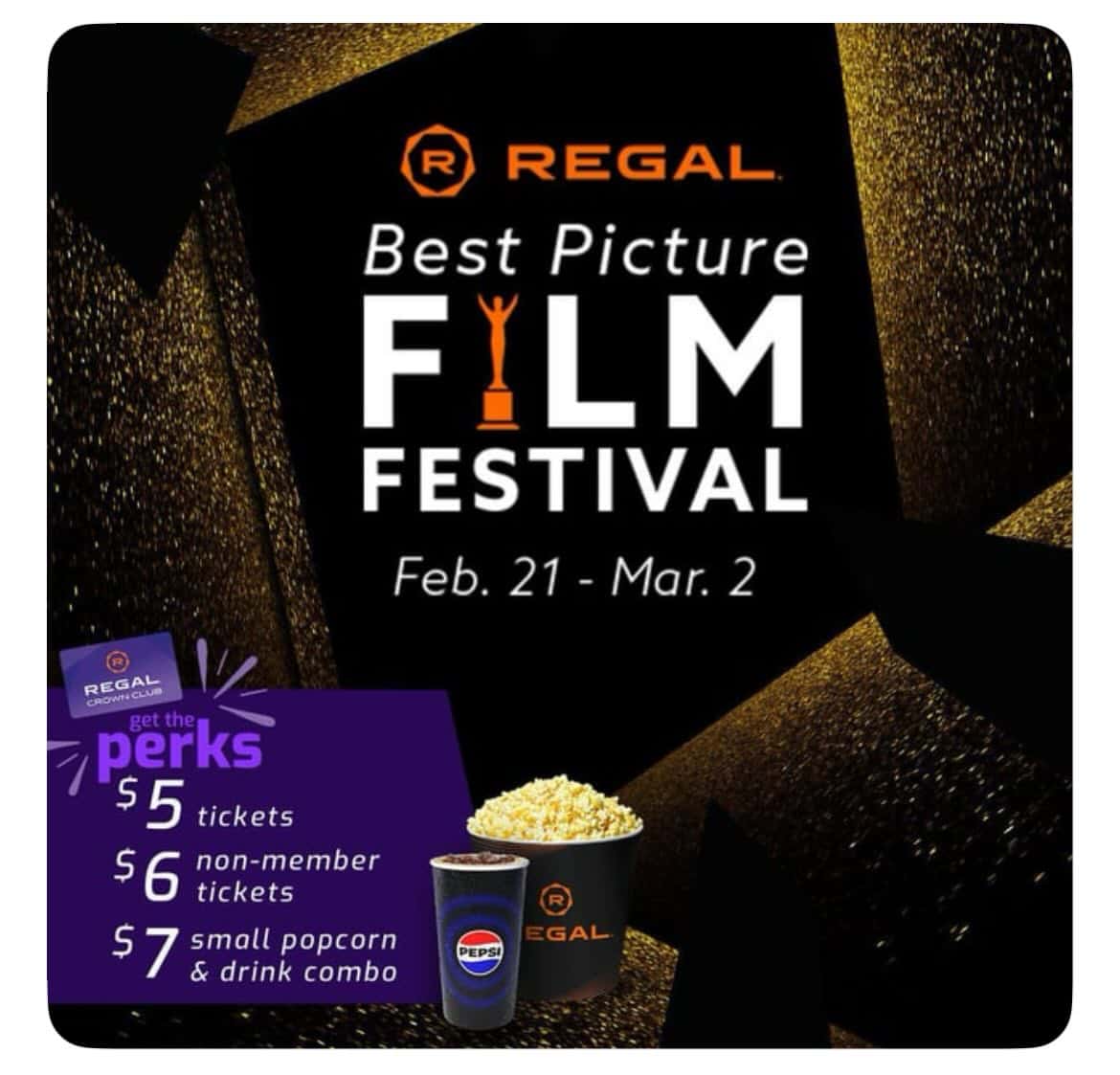 BONUS: Regal Crown Club members also enjoy a $5 concessions voucher for each ticket purchased (for any film featured in the Best Picture Film Festival) online via Regal’s site or app with Apple Pay. The bonus voucher is available from Jan. 23 to March 1, 2025.