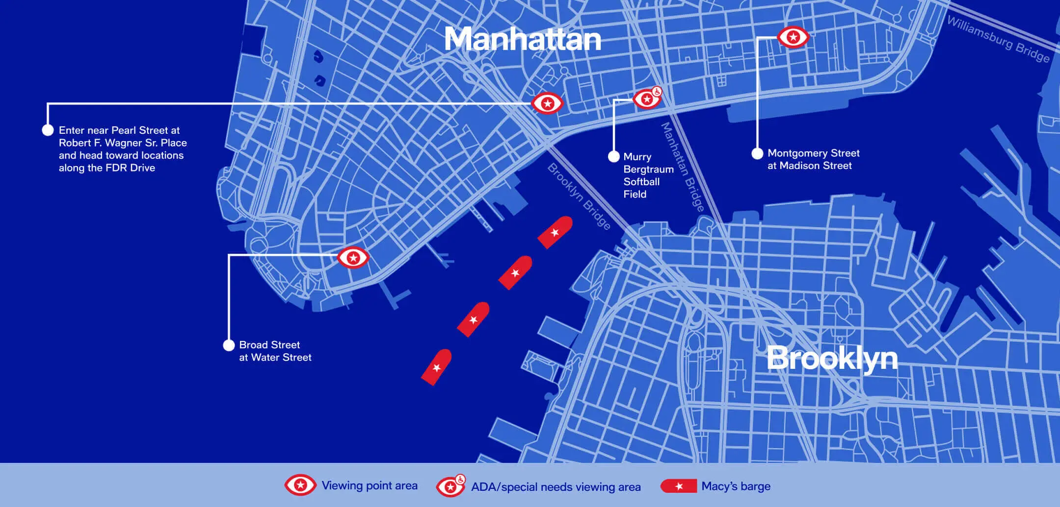 - ADA viewing will be available at the Murry Bergtraum Softball Field with access at Pike Slip and Cherry Street
