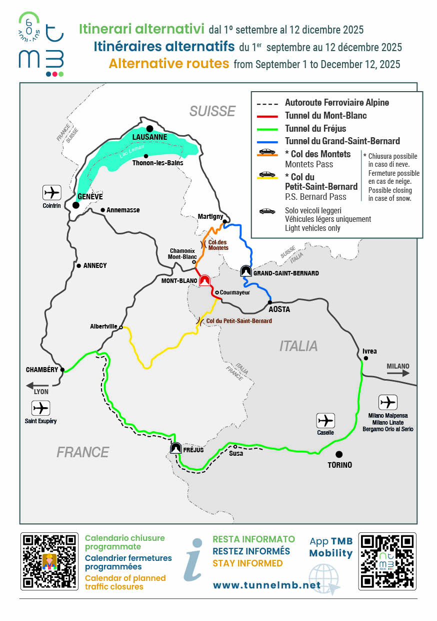 Alternative routes include the Fréjus Tunnel, which connects France and Italy via Modane in France and Bardonecchia in Italy.