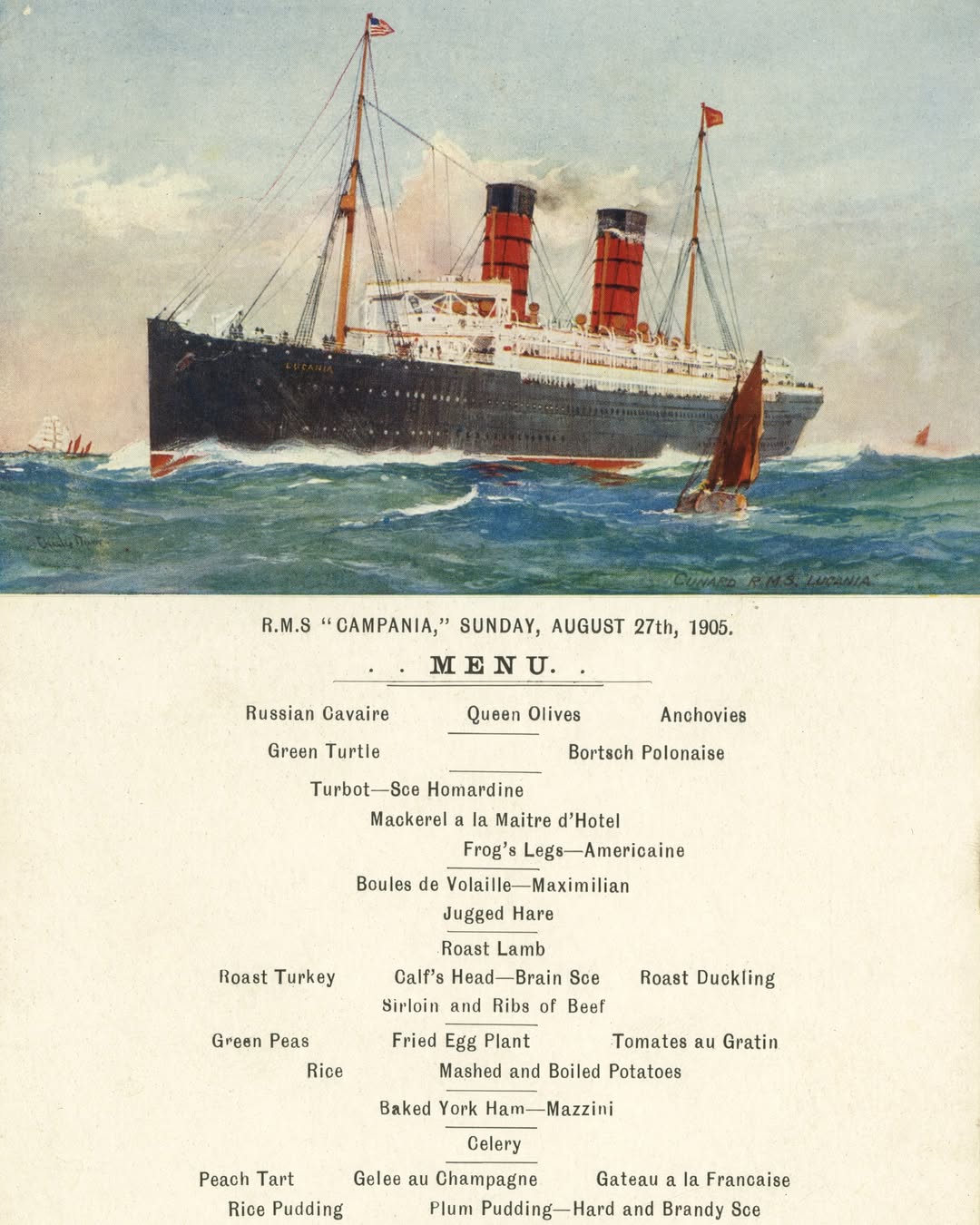 Step back into the first half of the 20th century and learn about the history of dining on planes, trains, and ocean liners which visited New York, including Cunard’s RMS Campania, whose 1905 menu is on display.
