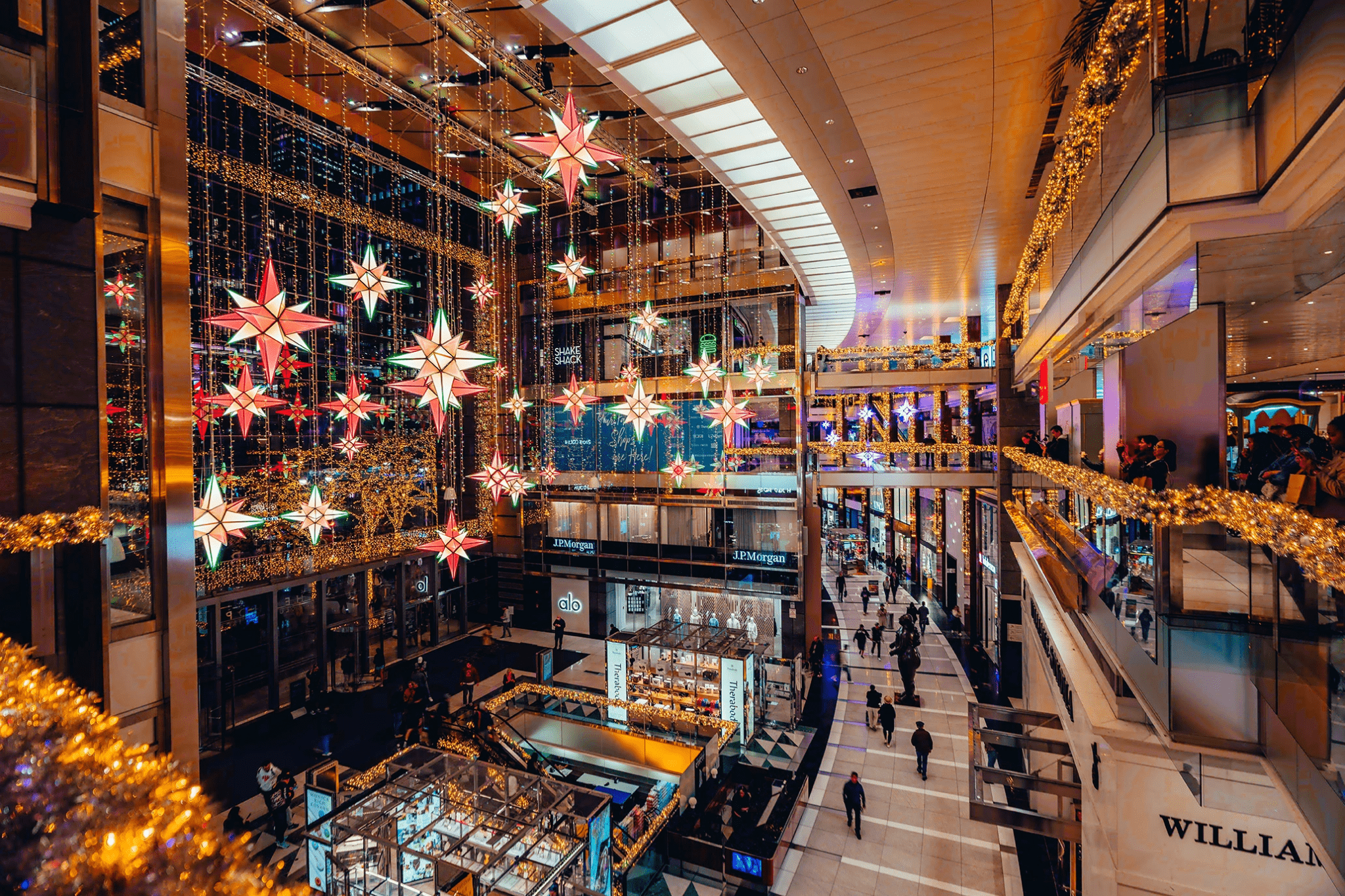 The mesmerizing color-changing stars perform choreographed light shows every 30 minutes from 5PM to midnight, set against a backdrop of shimmering garlands. Additional glowing stars suspended throughout the Ground Floor, along with sparkling photo moments. You can also watch from nearby, including from the steps and seating at Columbus Circle.