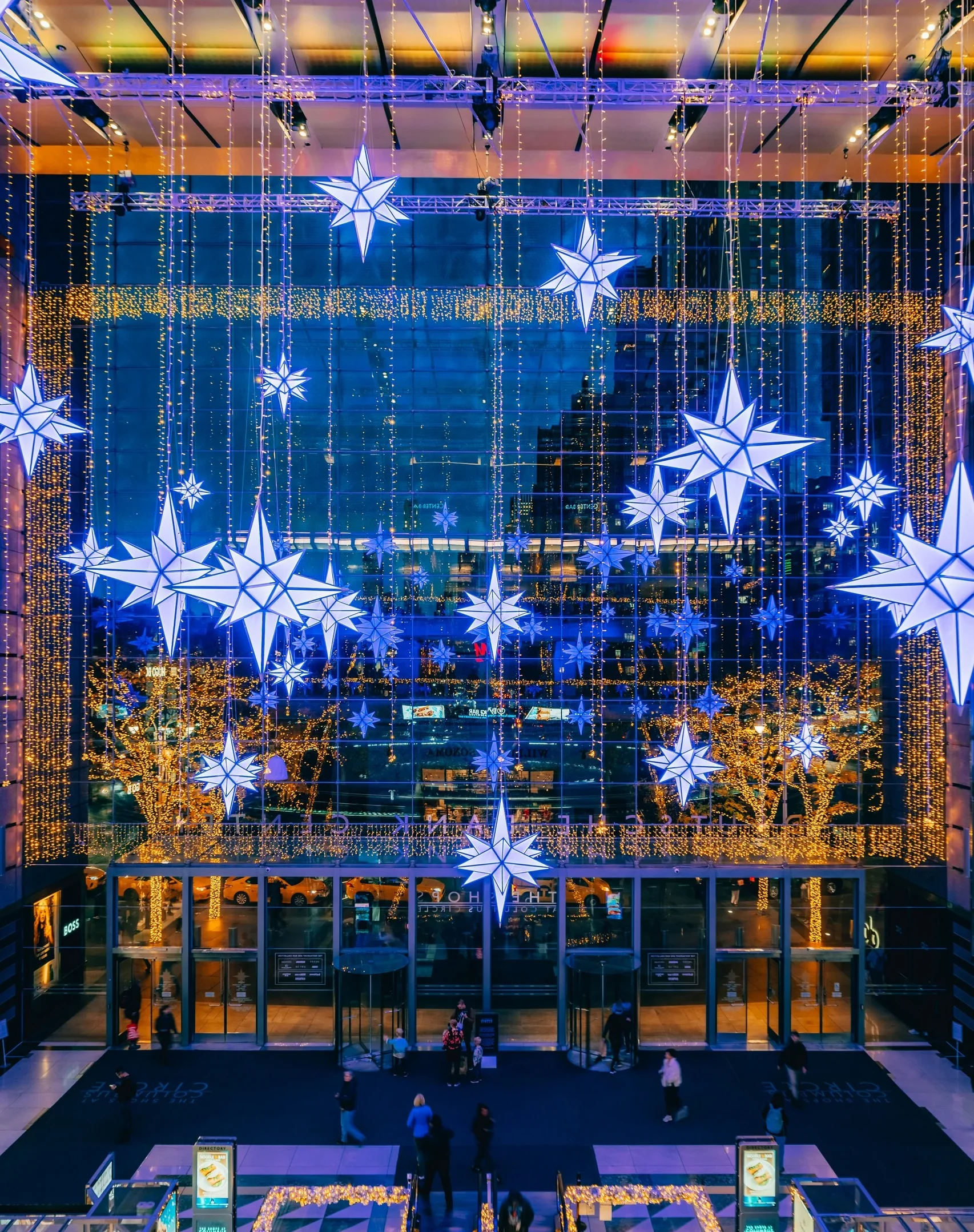 The mesmerizing color-changing stars perform choreographed light shows every 30 minutes from 5PM to midnight, set against a backdrop of shimmering garlands. Additional glowing stars suspended throughout the Ground Floor, along with sparkling photo moments. You can also watch from nearby, including from the steps and seating at Columbus Circle.