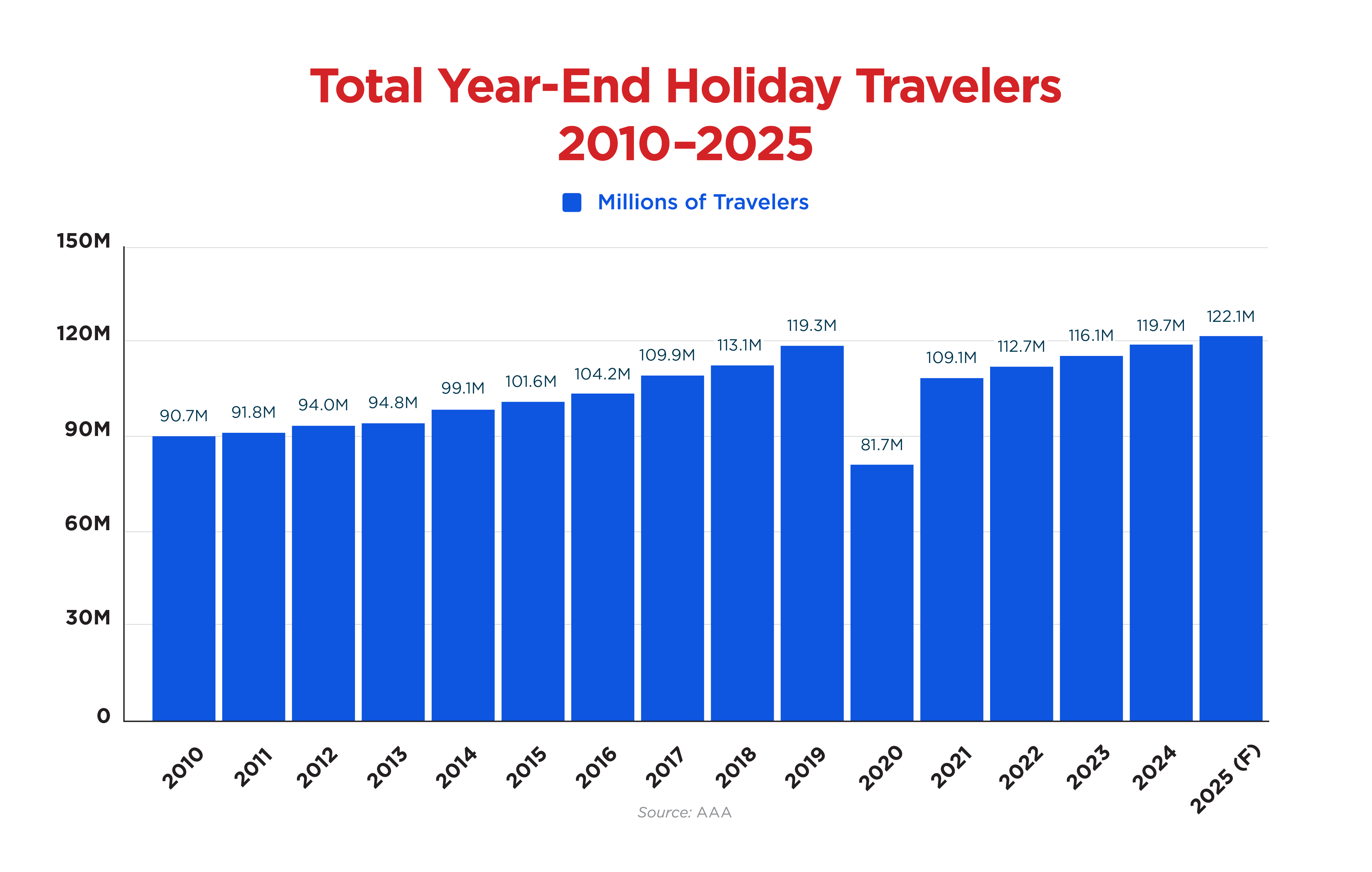 A record number of Americans than ever – 122.4 million of us – will be on the road, in the air, and on trains and cruise ships this two-week holiday season, Sunday, Dec. 20 2025 through Thursday, Jan. 1, 2026. So get ready for gridlock wherever you are.
