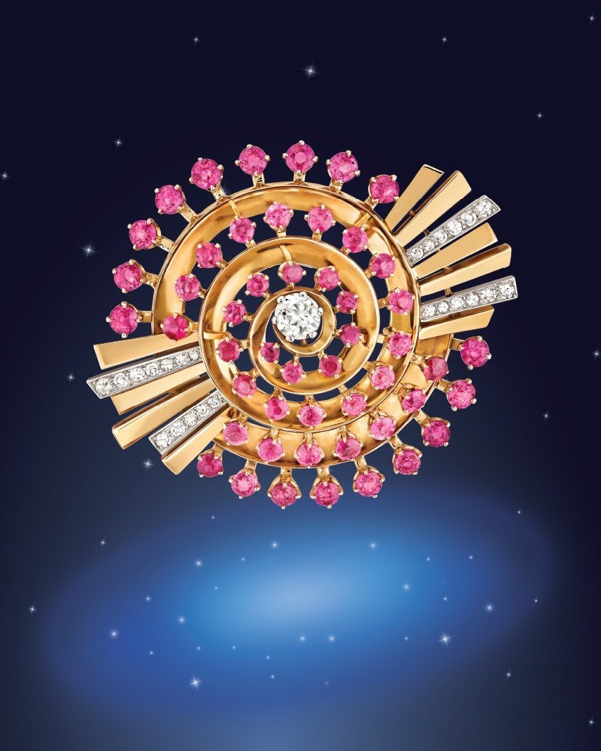 For millennia, people have been moved by the grandeur of space to explore the workings of our universe—and to create captivating works of art such as this spiral clip that’s composed of rubies, diamonds, platinum, and rose gold.
